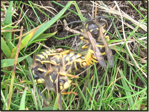 Plodding on up to the summit, we found several bundles of writhing wasps. In the middle of each bundle was a big wasp, a queen. That’s probably enough of a clue as to what was going on…