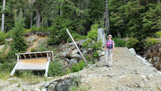 There are three lakes, all of which sport fine views to nearby summits and glaciers that were free of cloud on this warm, sunny and Clear day. The smoke seems to have dissipated from this area. In between the top two lakes the water plunges down some falls. Given that we'd been parkrunning today, their name, Holloway Falls, seemed quite appropriate.