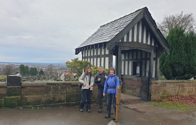 By the time we had slithered past the empty duck houses and reached the impressive lychgate entrance to the Fox Covert cemetery, the rain had passed and we enjoyed views across Warrington to the heights of Winter Hill and the south Pennines.